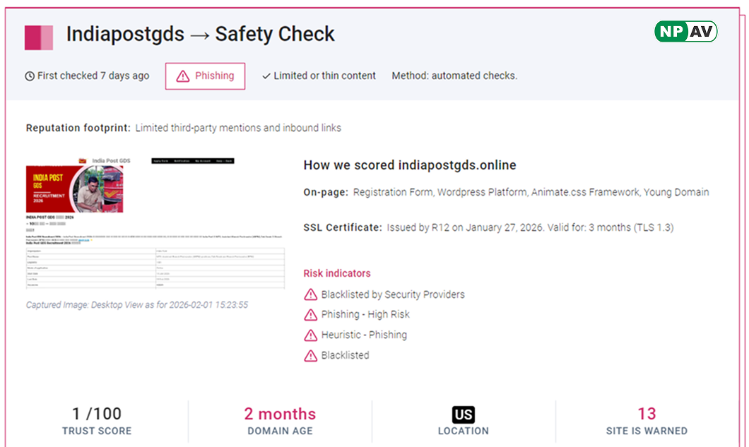 Cybercriminals are circulating a fake India Post GDS recruitment website – indiapostgds.online, which has been flagged by security platforms as a phishing and high-risk domain. The website falsely claims to offer India Post GDS Recruitment and imitates official branding to mislead job seekers into trusting it.